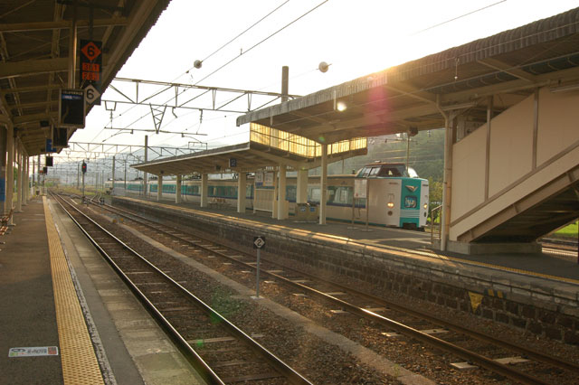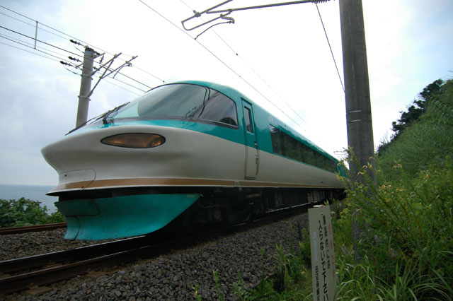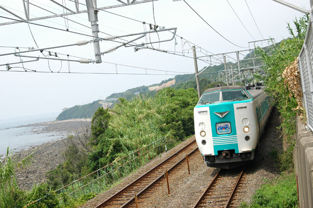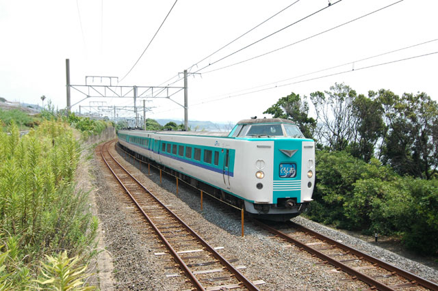 岩代駅から気がつけばかなり歩いていました。なんだか頭がぼーっと。。心臓の鼓動が異常に早い。。。腕を見ると、鳥肌が立っています。寒いわけではないのになぜ。。。はっ!これはまさか熱中症にかかっているのでは?!あわてて水分補給。。。水がありません!駅で買っておくのを忘れていました。これは大変です。こんなところで倒れてしまってはシャレになりません。あたりに自動販売機は。。。必死で探しまわって、ある別荘地の管理室にようやく販売機を見つけました。許可なく入れないのですが、そんなこと言ってられません。どうにか水を買い求め、ことなきを得ました。皆さん、真夏の撮影は気をつけましょう。本当に危ないところでした。で、水と用意していた昼食を平らげ、撮影再開です。381系スーパーくろしおを正面から捉えました。