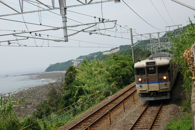 体を引きずるように駅に向かい、しばらく休憩しました。1時間ほど休憩の後、無理せずに駅近くのポイントで撮影再開です。113系普通列車です。海水浴に来られていた方と出会いました。何の写真を撮っているのか聞かれ、『海に入ると気持ちいいですよ』と、言われました。今日は暑いから気持ち良さそうですね。