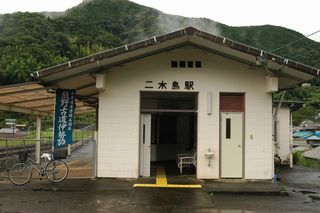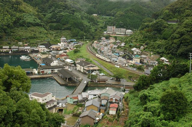 皆様こん**は。さてさて、紀勢本線の続きをお送りいたします。今日は、紀勢本線の海の風景を見にやってきました。。。が、どんよりと曇った空。日本有数の多雨地域ということで、ちょっとは覚悟してきましたが、、、ま、雨なら雨の風景をということで、二木島駅付近にやってきました。二木島駅は、入江の小さな集落を見下ろす突堤の上にあります。