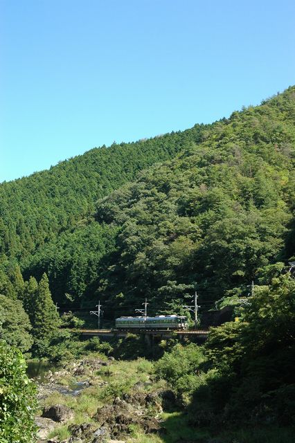 続いてやってきたのは、松阪~伊勢奥津を結んでいるJR名松線。家城~伊勢奥津間ではまだスタフ閉塞方式が残っており、通票を渡す姿を見ることができます。やってきたのは、伊勢八知~比津間の渓谷。ここで列車を待ちます。うっそうと茂った緑が美しいですね。