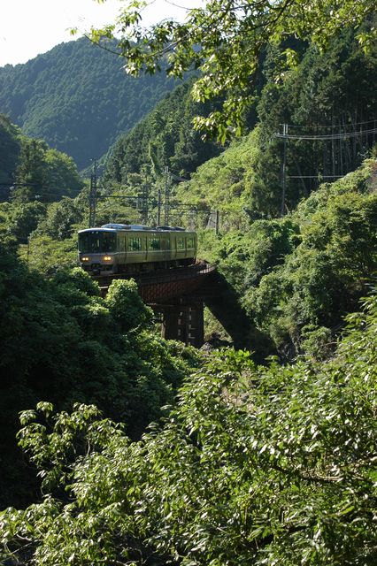 さて、丹波大山までの渓谷にやってきました。自転車だと駐車に気を遣わなくていいのがまたいいですね。渓谷を行く223系です。