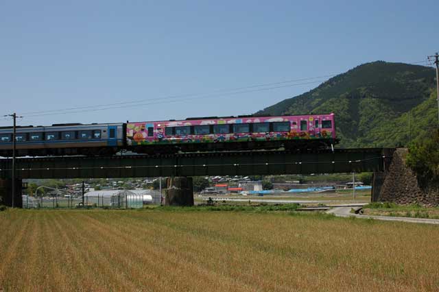 おや?団体臨時列車がやってきました。予想してなかったので後追いしかとれませんでしたが、ラッキーです。後から雑誌で調べたら、薬王寺への参拝客を乗せた臨時列車だったようです。