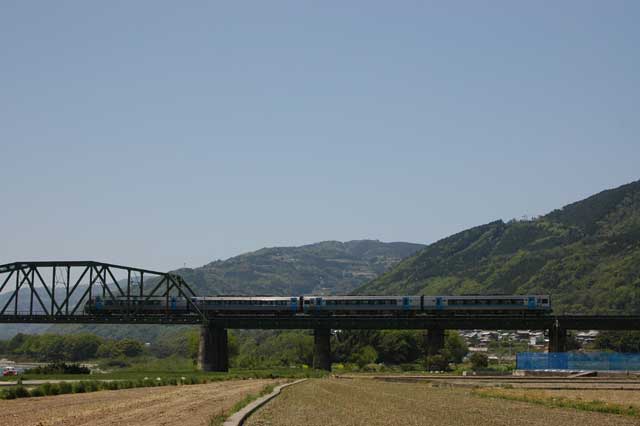 吉野川沿いを線路は走っています。ここは吉野川と列車を写せる絶景ポイントです。キハ185系、特急『剣山』がやってきました。