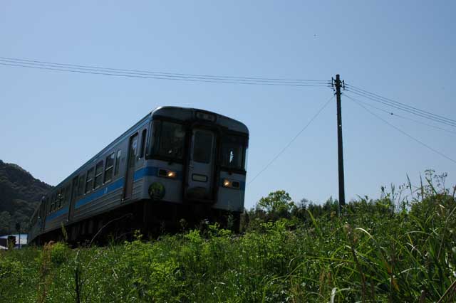 185系うずしおを撮影した後、峠を降りることにしました。降りる途中、不意にエンジン音が。。。慌ててカメラを向けてみると、2006年6月から営業運転が開始される1500系気動車がやってきました。試運転でしょうか?思わぬ遭遇でした。