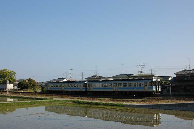続いてやってきた普通列車徳島行き。1000系気動車です。丁度田んぼに水が張られており、水鏡のように列車の姿を映し出しています。